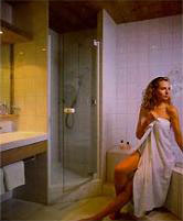 hochwertiges Bad inklusive Whirlwanne, Safe und Minibar.